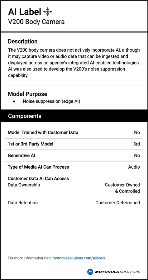 The V200 is a sophisticated body camera featuring livestream recording and GoLive Audio, enabling employees to quickly connect with a supervisor or security agent while capturing footage from every angle. An intuitive top display shows connectivity to WiFi and the security monitoring center, as well as battery levels.